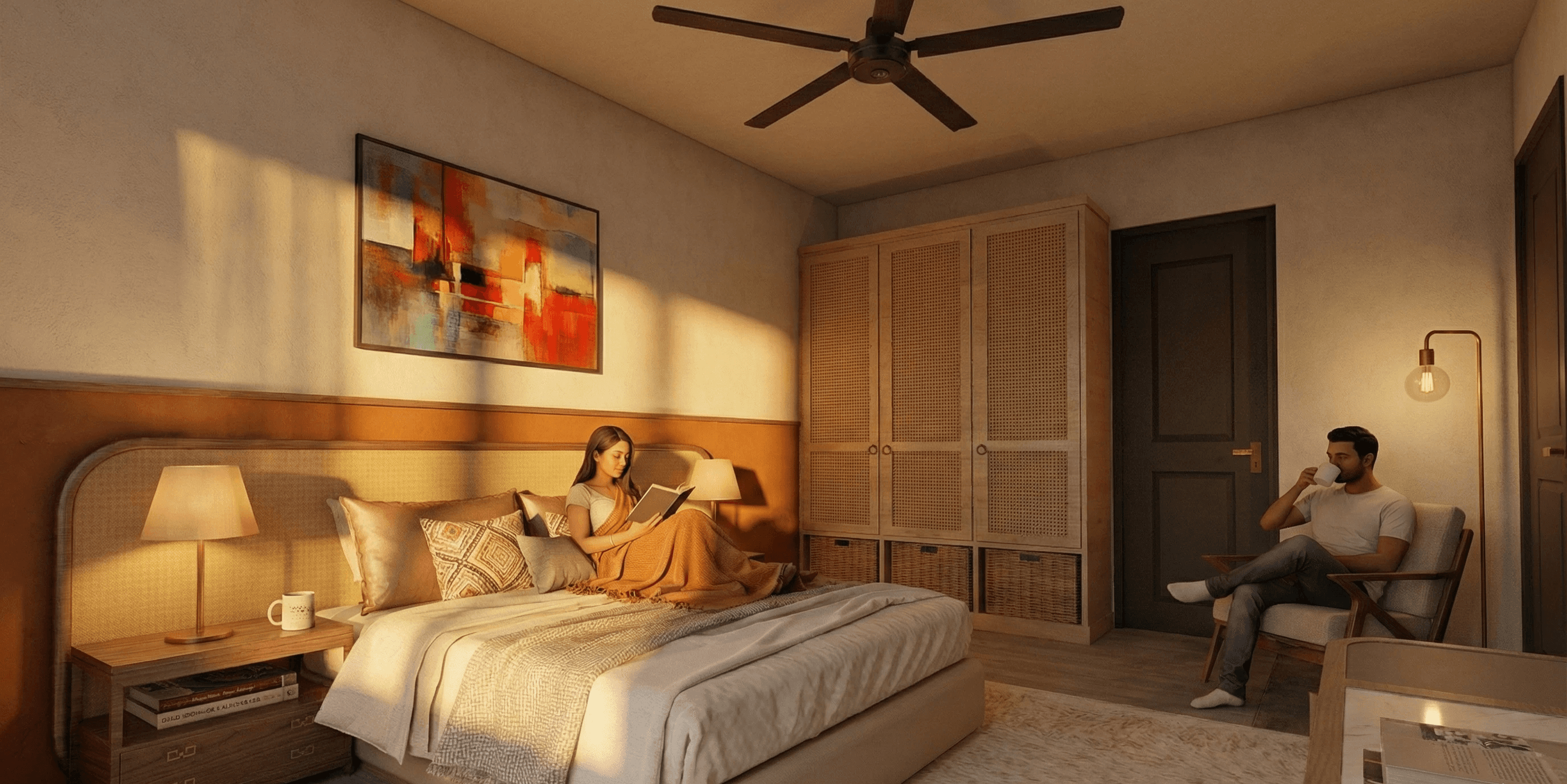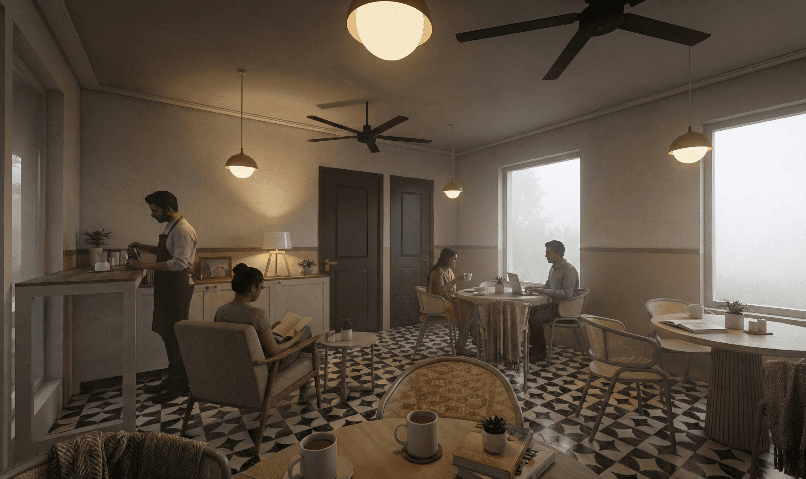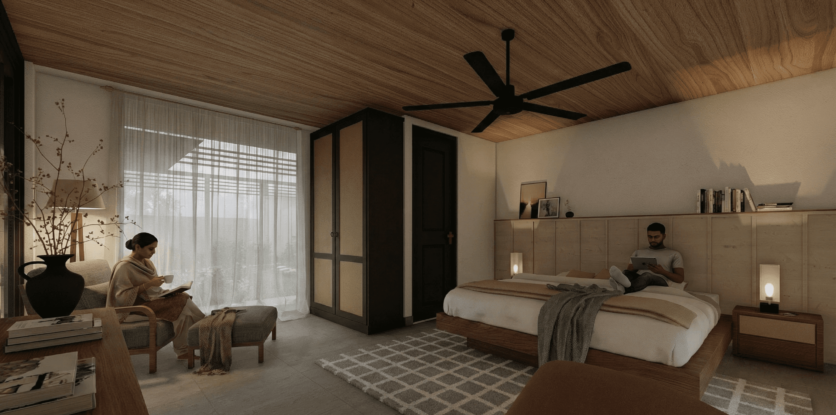 This BnB apartment is designed as a sanctuary of light and calm, where large arched windows frame the majestic peaks like living art. The open-plan living area features a sleek marble island and modern furnishings, bathed in the warm glow of the setting sun. The private quarters continue this theme of serenity, blending functionality with comfort through dedicated workspaces and cozy sleeping nooks that look out over the valley. Would you like me to compile the text for all thirteen projects (Divar, Anjuna,