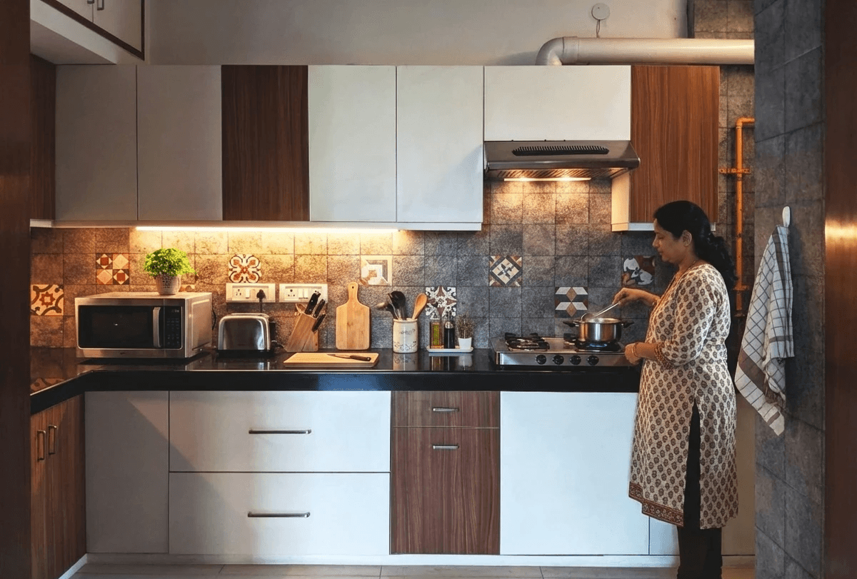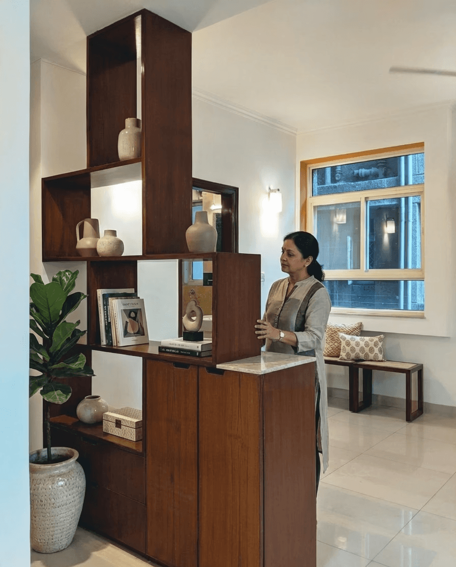 The central concept for this project was "Framing Views." We wanted to draw the lush exterior tree canopy into the home, so we treated the windows as deep, habitable thresholds rather than simple 2D openings. By painting the deep reveals in a warm terracotta ochre, we created a striking contrast against the white walls, effectively turning every window into a living painting. Spatially, we focused on "functional nooks"; structural recesses were converted into productive study corners with integrated seating and storage, ensuring that every square foot served a purpose. The material palette balances this bold color use with calming elements like beige upholstery, marble coffee tables, and natural wood finishes to maintain a serene domestic atmosphere.