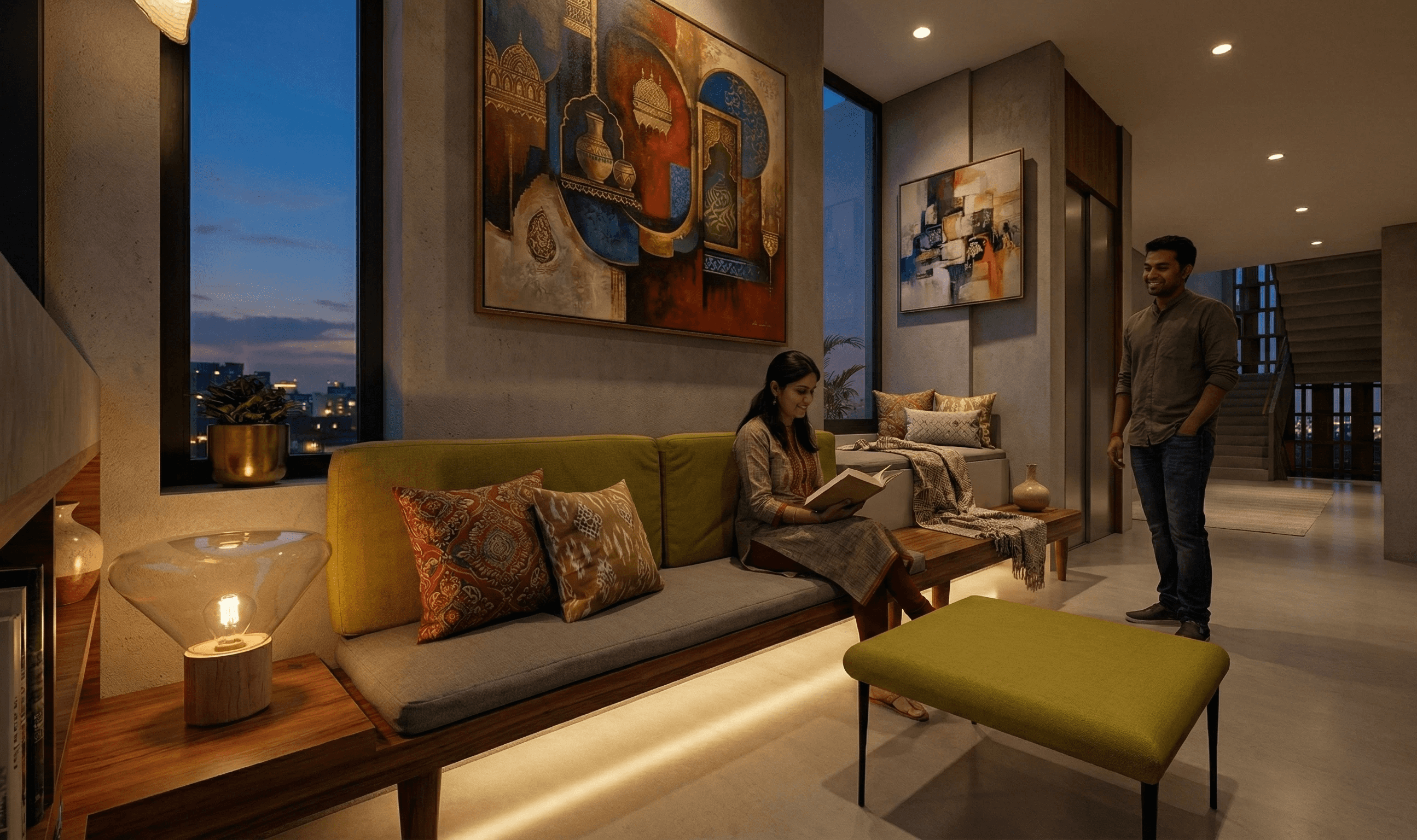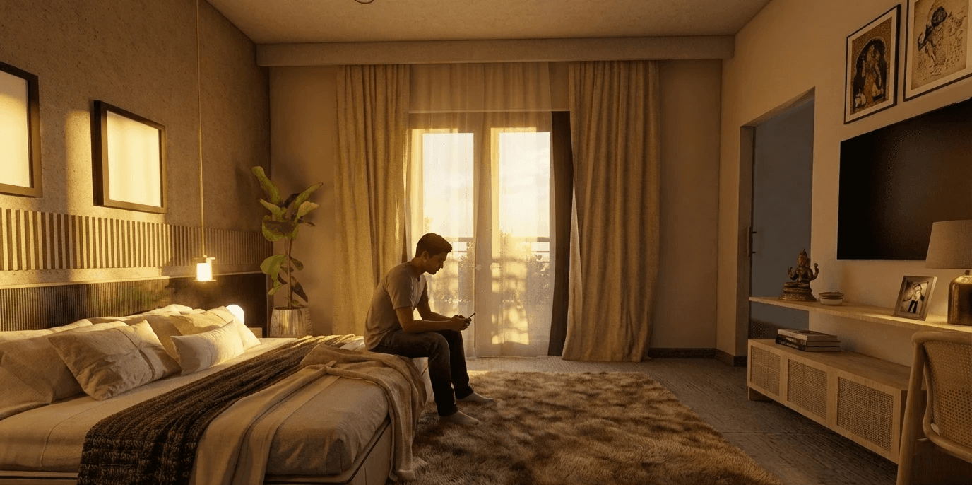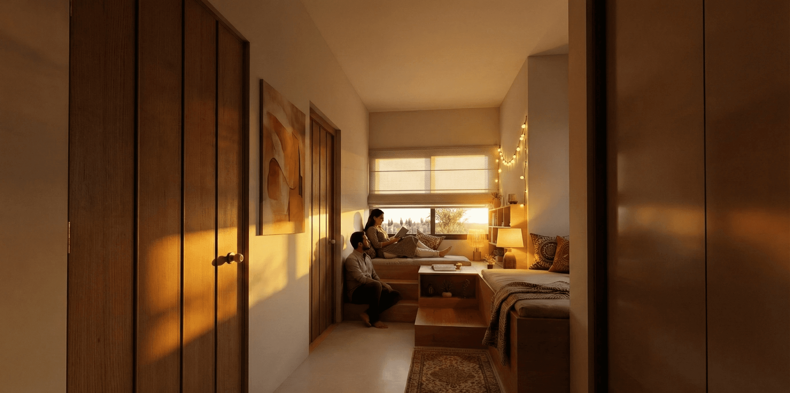 This urban residence is designed as a private sanctuary, shielded from the street by a sleek boundary wall that gives way to a welcoming, social courtyard. The architecture is defined by clean geometric forms and deep-set windows that capture the dramatic "golden hour" light, casting long shadows across the beige facade and interior surfaces. Inside, the home balances openness with intimacy; living areas feature textured fluted walls and sprawling window seats to encourage connection, while glass-lined corridors ensure a seamless flow of light. The private quarters are tailored with distinct personalities—ranging from soothing sage greens and warm woods to bold maroon accents—each offering a personal retreat equipped with cozy nooks for reading and rest.