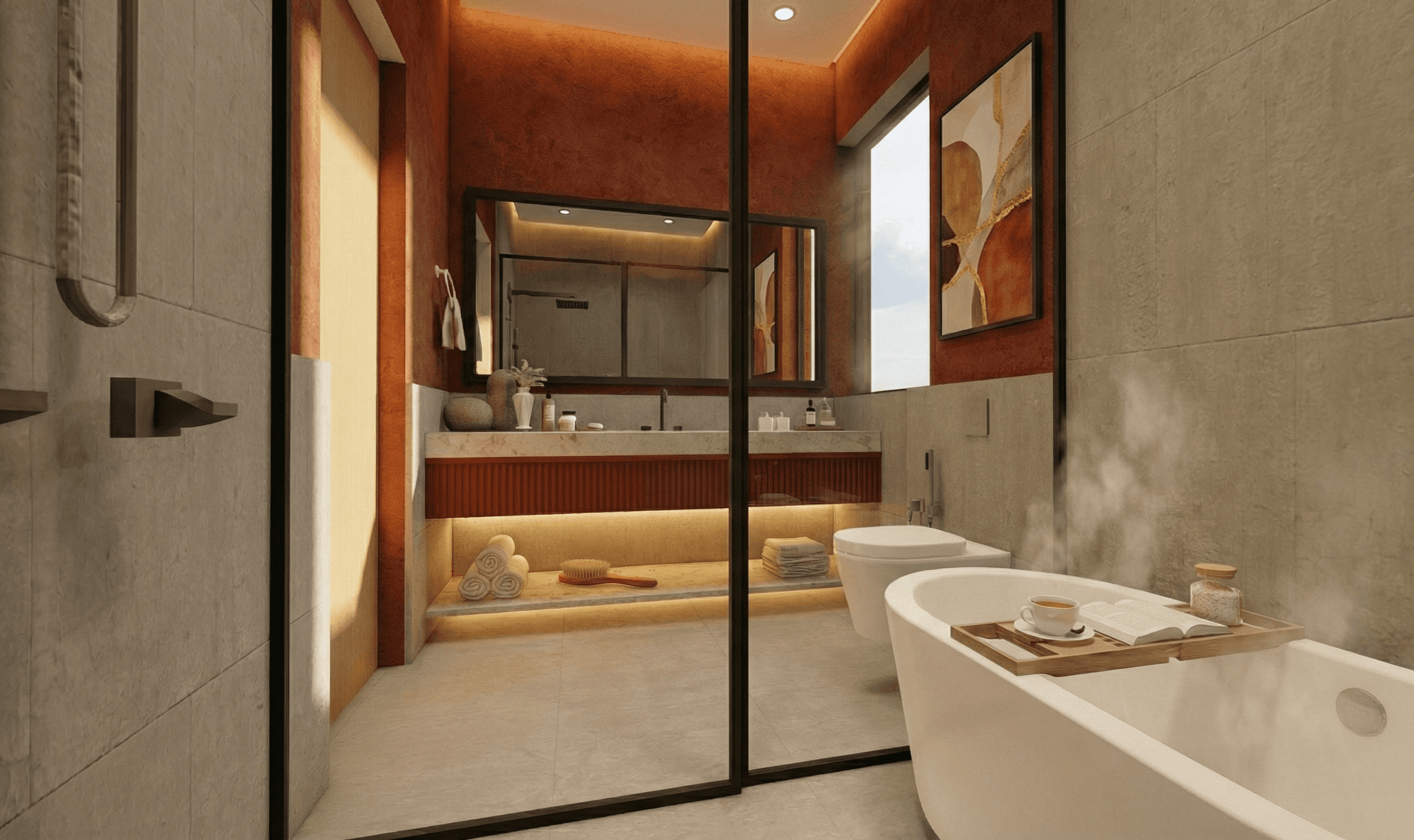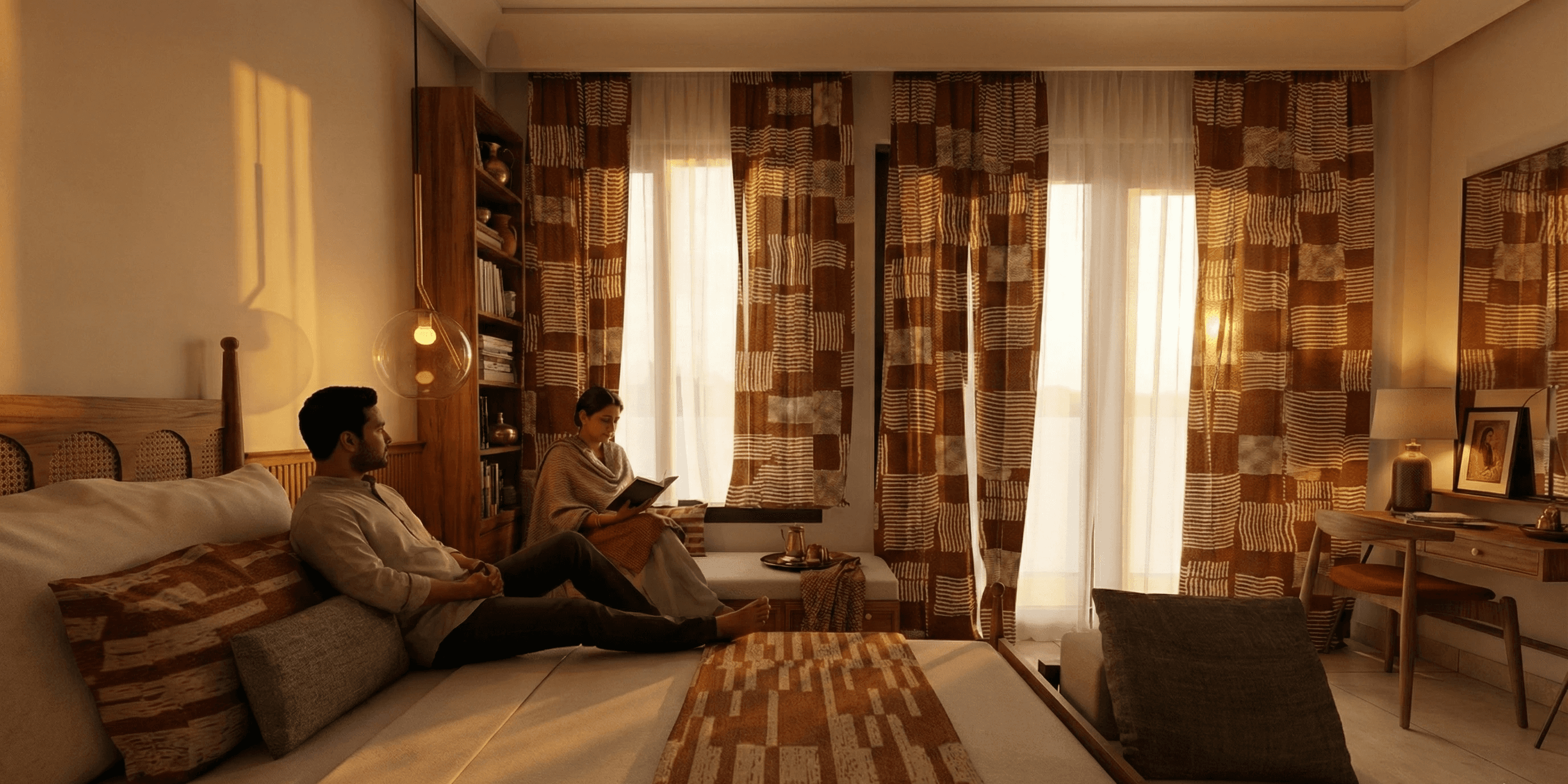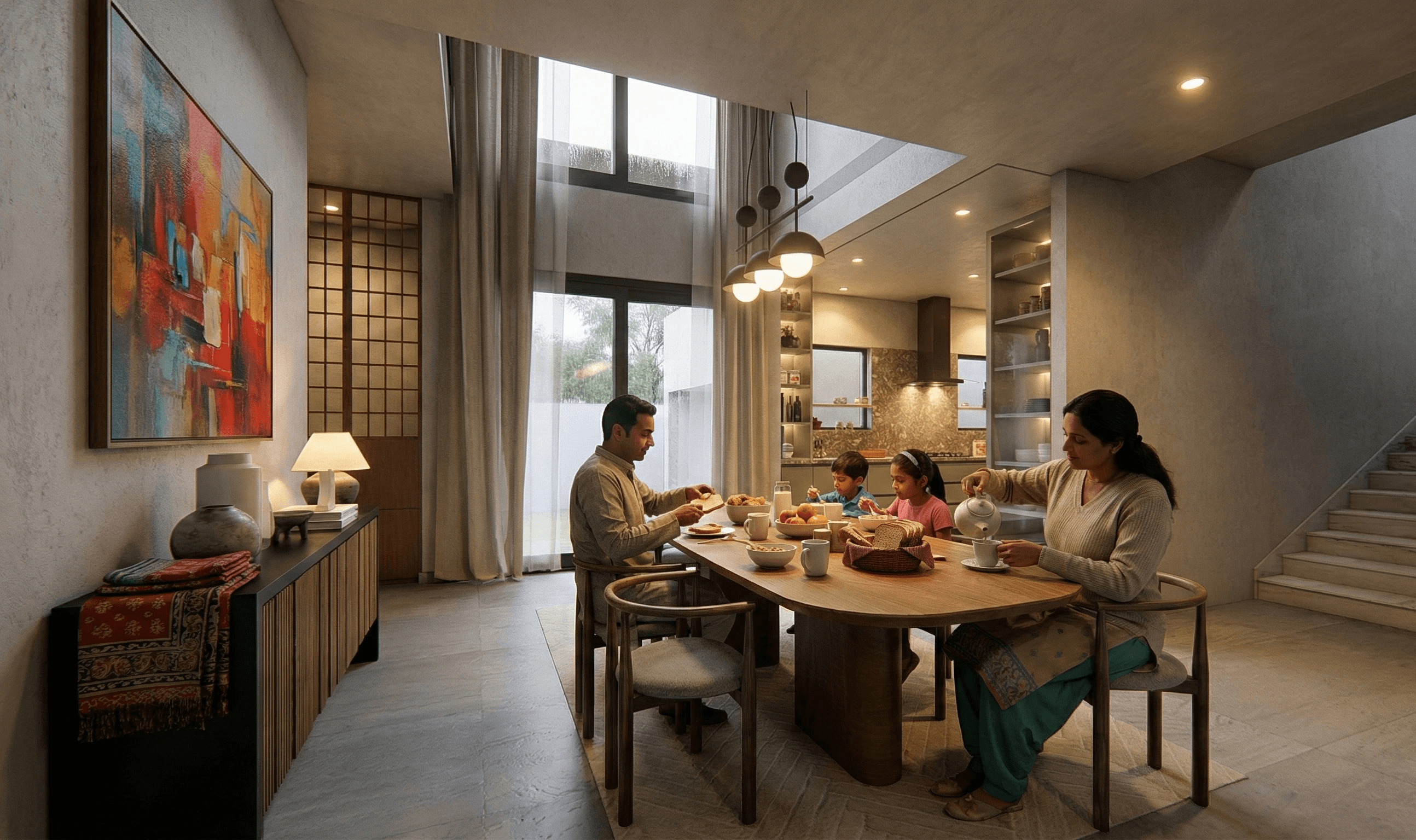 This urban residence is designed as a private sanctuary, shielded from the street by a sleek boundary wall that gives way to a welcoming, social courtyard. The architecture is defined by clean geometric forms and deep-set windows that capture the dramatic "golden hour" light, casting long shadows across the beige facade and interior surfaces. Inside, the home balances openness with intimacy; living areas feature textured fluted walls and sprawling window seats to encourage connection, while glass-lined corridors ensure a seamless flow of light. The private quarters are tailored with distinct personalities—ranging from soothing sage greens and warm woods to bold maroon accents—each offering a personal retreat equipped with cozy nooks for reading and rest.