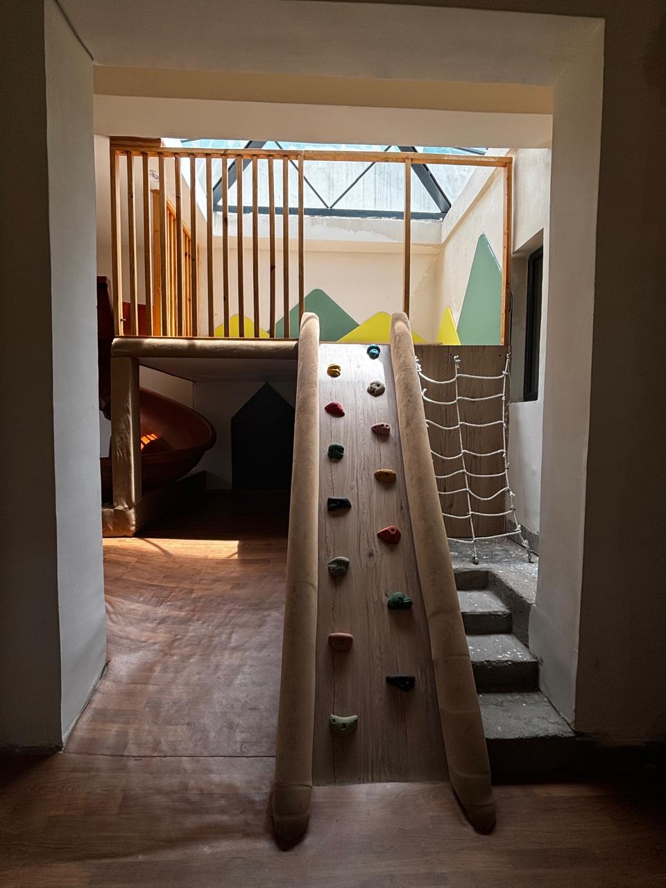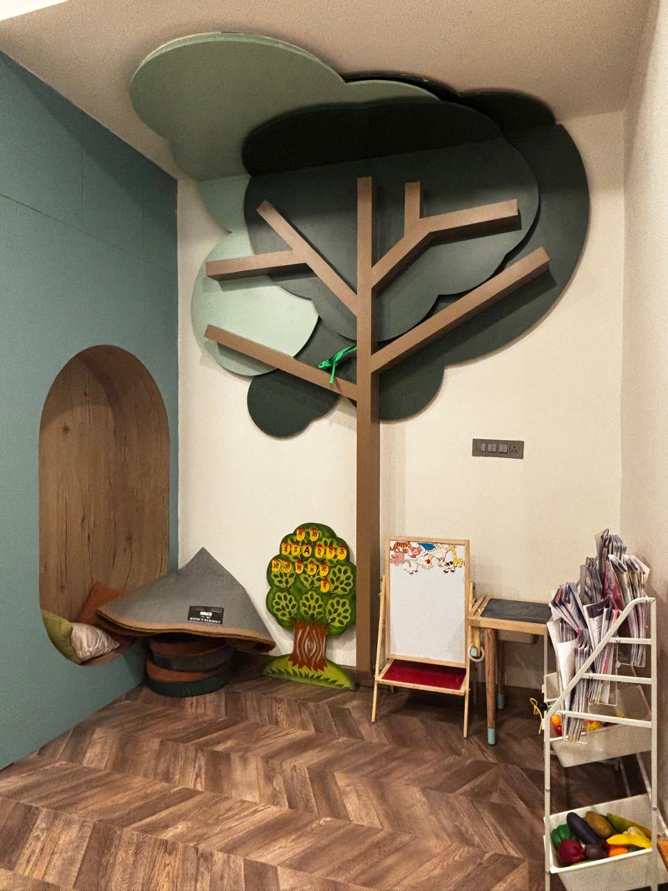 The design narrative for Grassroots Global focuses on "stimulation and scale." We approached the facade as a piece of urban sculpture, utilizing folded louvers to create dynamic shadow play that softens the building's mass while establishing a strong visual identity connected to nature. Internally, the environment is scaled down to the child's perspective; we replaced rigid classroom boundaries with soft arches and integrated "discovery pockets" like the 'Peek-a-Boo' window zone and under-stair planter cubbies. To foster a safe yet active environment, we utilized impact-absorbing materials for wall features and ramps, allowing the architecture itself to become a playground.