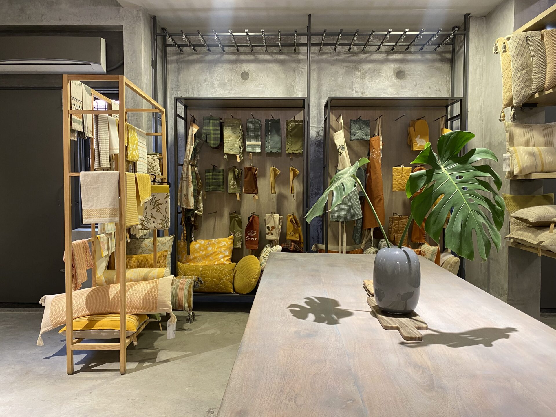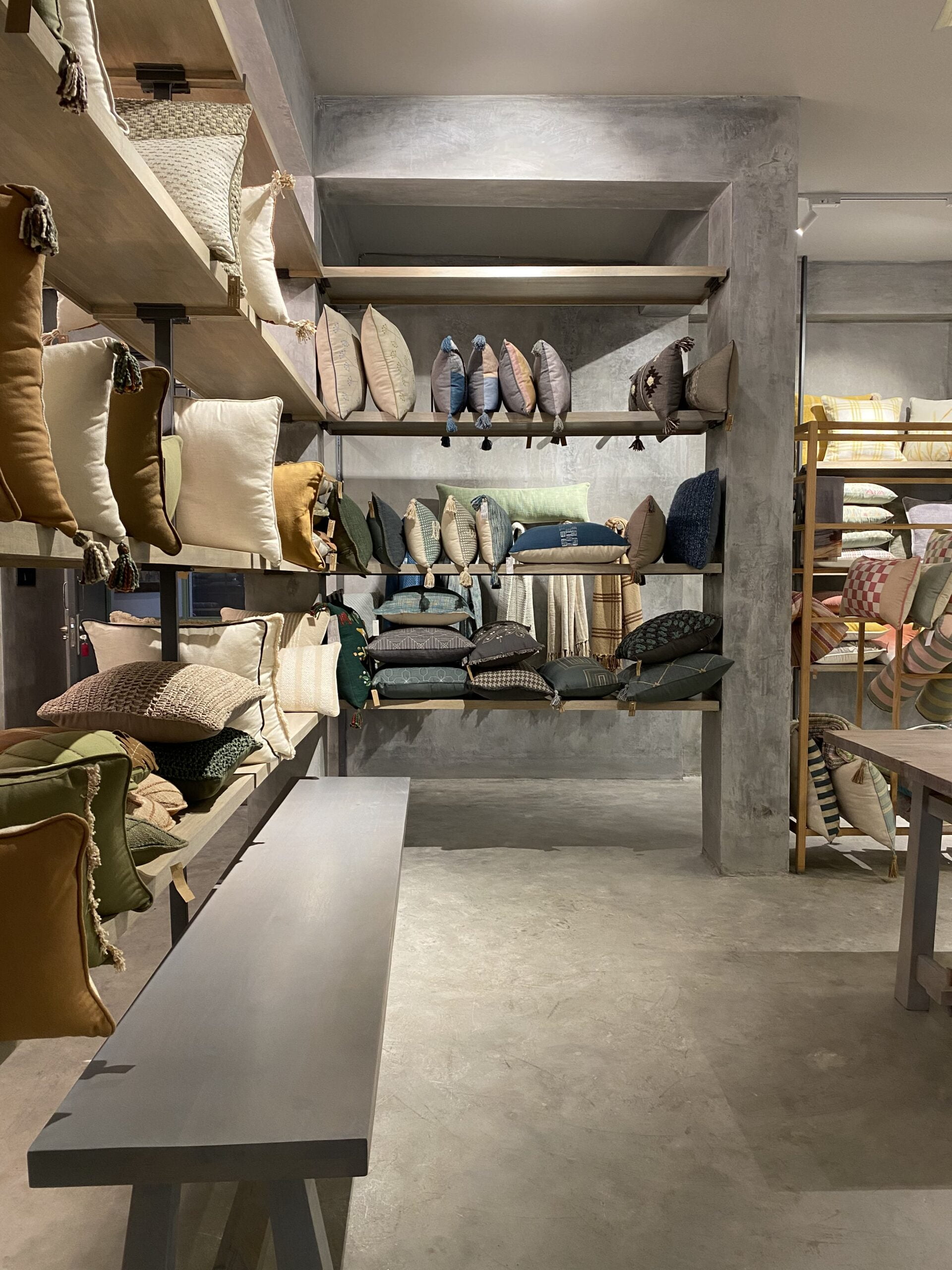Industrial minimalism meets artisanal warmth: Sleek black metal racks and raw concrete surfaces provide a neutral backdrop for a vibrant collection of handcrafted textiles.